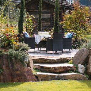 Feel the first rays of sunshine at breakfast when the morning sun rises from the Ifinger and slowly illuminates Merano. Enjoy your breakfast and evening meal accompanied by the twittering of birds and the sound of water. Mediterranean plants, flowers, and blossomsin front of the scenery of our apple orchards and new vineyard, and a centuries-old chestnut treesurround the delightful locations at Kiendl.