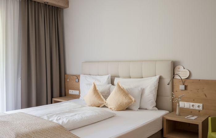 Comfort double room with south-facing balcony with panoramic view of Merano and the mountains or with south-west-facing balcony with panoramic view of Merano and the forests of the Naif valley.